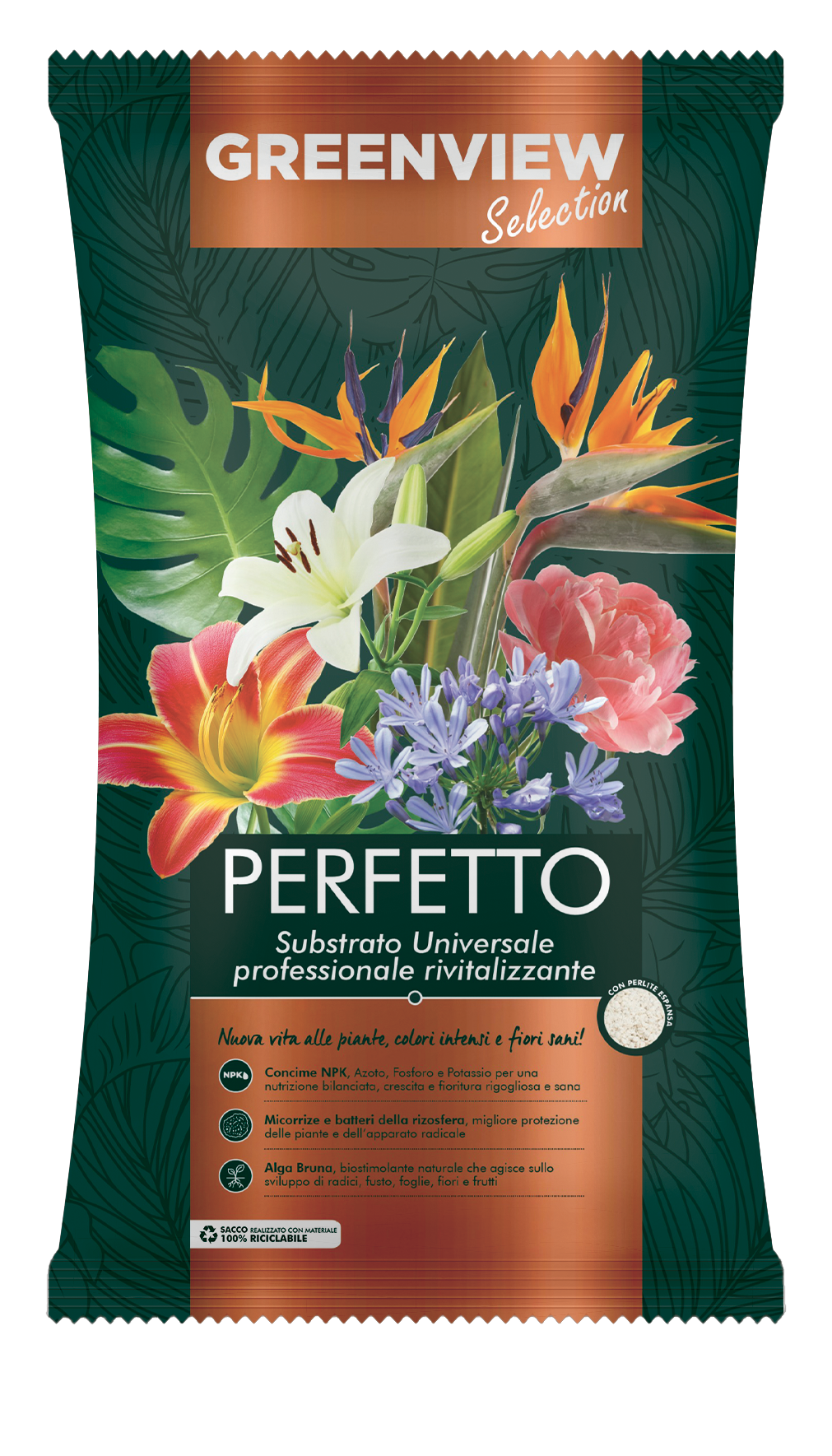 Miscela professionale rivitalizzante con Micorrize, Batteri della rizosfera, Alga Bruna, Perlite espansa, FibraGreen, Cocco Peat e concime ternario